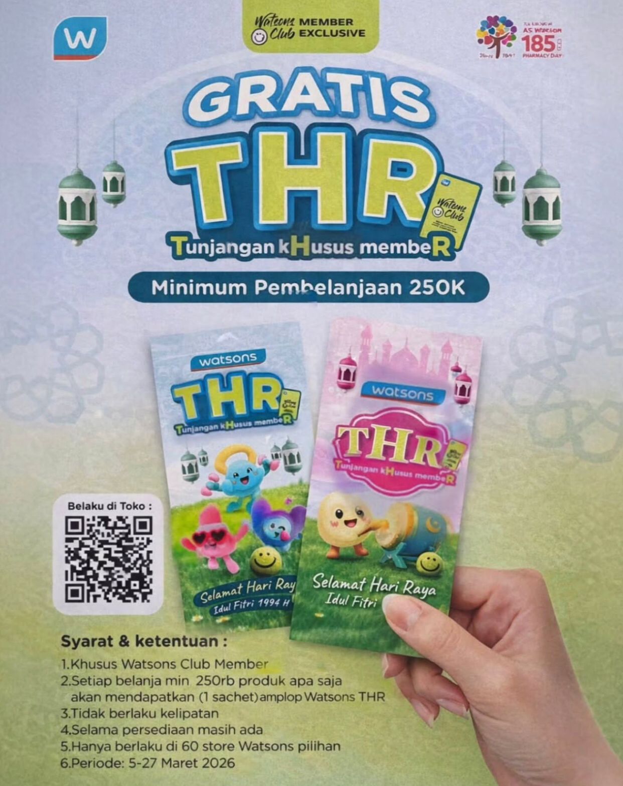 Promo ini KHUSUS buat Watsons Club Member dari tanggal 5 – 27 Maret 2026 di 60 store pilihan ya! (Bisa scan QR code di atas buat cek lokasi tokonya).